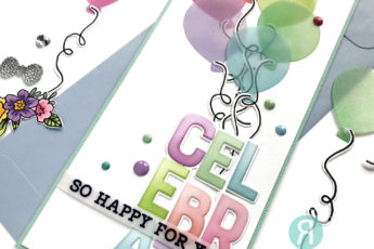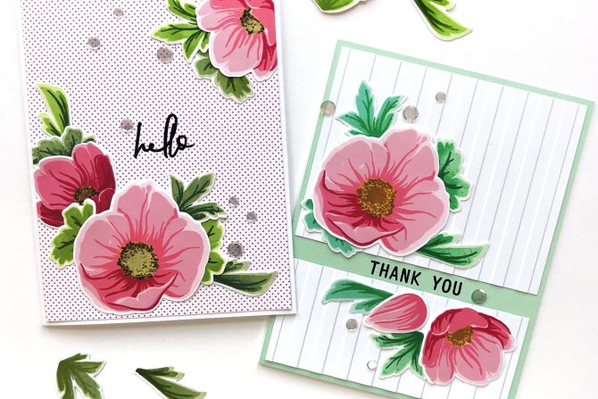 I kept this card very simple with only the stamped “hello” sentiment from the Hellebore stamp set and some clear flat sequins to adorn. For a more dynamic look, I overlapped the edges of the card panel with the bloom and leaf die cuts and trimmed off the excess.