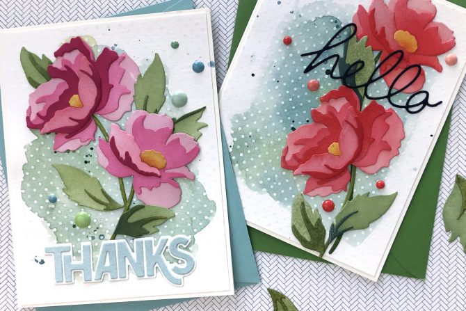 The greeting on this card is made with the Bold Thanks Die set and is made up of layers of pale blue cardstock against a watercolor cardstock background die cut. Each of the cards is completed with enamel dots in coordinating shades.