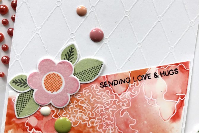 I also stamped some Folksy Florals flowers and leaves with Altenew Crisp Dye inks and die cut the shapes. I cut the inked Yupo paper on an angle and adorned the edge with the die cut flowers. I stamped the sentiment “Sending Love and Hugs” from the Adore You stamp set, with black ink and added a few coordinating enamel dots to finish the card.