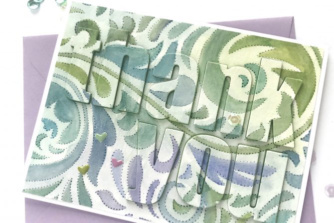At this point I also knew I didn’t want to cover up or lose any of that beautiful painted panel, so I decided to keep it simple and die cut the Bold Alphabet Dies block letters spelling “thank you”, pop them up with some fun foam die cut letters behind and glue them back into their openings for a very subtle but wonderfully textured finished card!