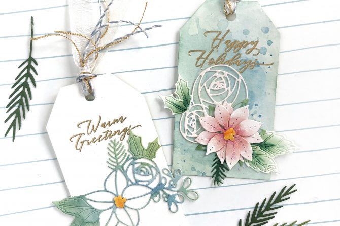 For the blue watercolor smooshed tag, I painted three layers of the smallest leaf die in the Poinsettia dies set, and once dry, glued them all together with a die cut center on top. I used Altenew Artist Markers to color the leaves, then adhered the pink flower on top of the Cluster die cut. I stamped another greeting from the Holiday Tag Sentiments set and gold heat embossed once more. Both tags are finished with a white ribbon/gold cord/blue striped baker’s twine tied to the top of the tag.