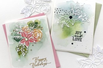 I stamped the sentiment onto black cardstock and mimicked the look of a shadow die cut by fussy cutting around the words. I added the “you” with die cut and stacked alphabet letters from Sizzix and Tim Holtz. Then, as is often the case on an all-over design, I found the background a little too busy and it was competing with the greeting, so I popped them up with foam tape and adhered them to a strip of vellum paper. That’s a trick that often saves the day!