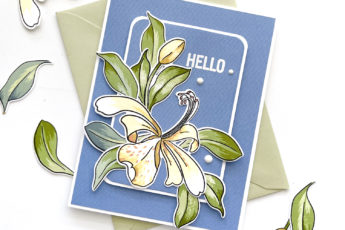 I die cut each of the images with the coordinating dies and arranged the leaves to cascade, popping up the bloom with foam tape behind. I adhered all of the stamped pieces to a card panel debossed using the Dotted Swirls Debossing Die and stamped the sentiment onto this card panel as well.