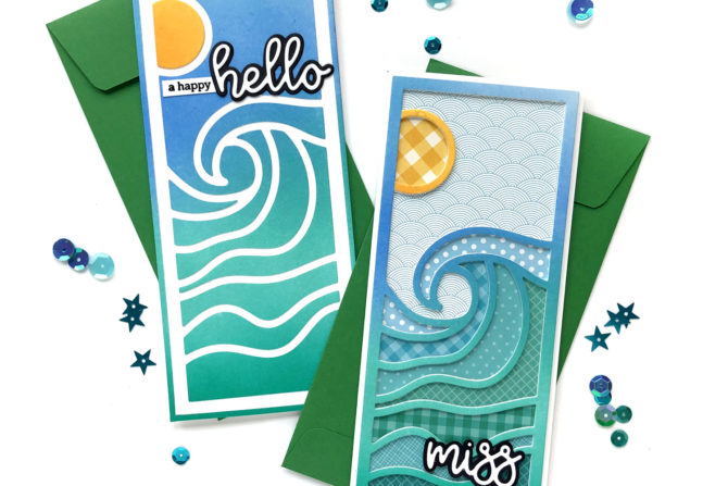 Next up are the first mini-slimline cards I’ve ever made, measuring 2 7/8”x 6 7/8”. I chose those dimensions because they fit the Abstract Seascape Slim Cover Die so nicely.