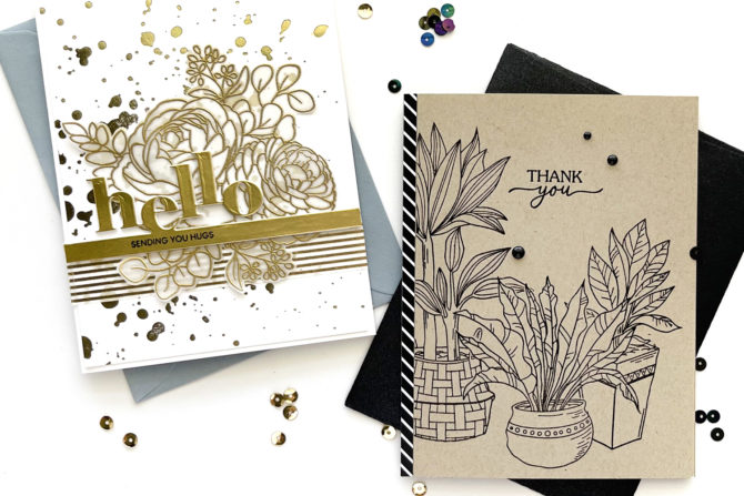 My second card features the Happy Petals stamp set, the Splatter Hot Foil Plate and the Tiny Sentiments Hello Die and Tiny Sentiments stamps.