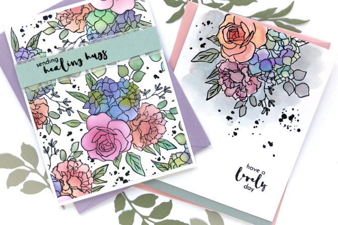 But ultimately, you know there’s going to be a watercolored card in the bunch! For the last card, I stamped on Altenew smooth watercolor cardstock with Obsidian Pigment ink and heat setting with clear embossing powder.