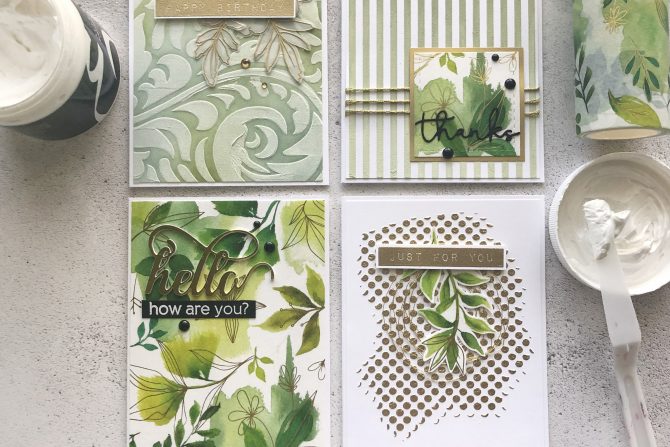 For this card, I smeared some moss ink and some embossing paste on my craft mat and mixed them together. I used the Classy Stripes stencil and applied the tinted embossing paste from top to bottom with the darker blend on top and gradually adding lighter (more paste, less ink) embossing paste at the bottom. Smoothing the embossing paste back and forth a little, allows the colors gradation to blend smoothly.