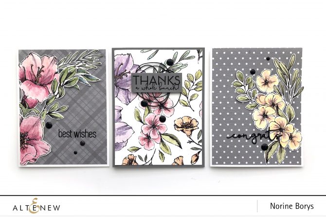 With all of the colored and hand cut blooms and leaves laid out, I arranged and fiddled until I was happy with each card layout and glued them all down. The “best wishes” sentiment is stamped from the Dainty Swiss Dots stamp set, and the “congrats” is black cardstock die cut with a die from the Signature Words die set. The grey plaid and polka dot patterned papers are from Core-dinations.