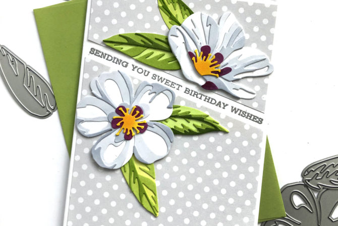I die cut all the layers of the blooms, leaves and stamens and colored them with alcohol markers to get the exact shades I wanted. I assembled all the layers and arranged them on a card panel to allow a slanted sentiment strip to be stamped between the layers of background patterned paper and flowers.