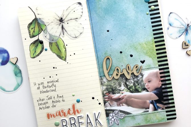 I stamped a couple of the leaves from the Inked Rose and Inked Flora stamp sets, then colored them with the new green Artist Markers as well as some Ocean Waves Artist Marker.  I used one of the beautiful watercolored acetate butterfly die cuts over top of the stamped and colored leaves, and the acetate March word plus some chipboard alphabet letters to create my title.  I also included a small stamped and die cut black & white embellishment of a flower cluster – from the BAF-Poppy stamp set.  Then a few ink splatters and this layout is finished.  Another sweet memory in the memory bank!