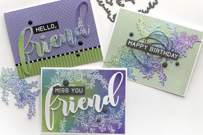 On to the next card. So, that friend die cut? It was cut from the ink blended panel of the first card above. And then all the white friend die cuts were cut and stacked and nestled into the opening left from this die cut. Totally unnecessary, lol! No reason at all that I couldn’t just ink blend another card panel to provide this die cut, and leave the above card panel intact. But remember, I was chasing tangents without any clear idea where they would end up!