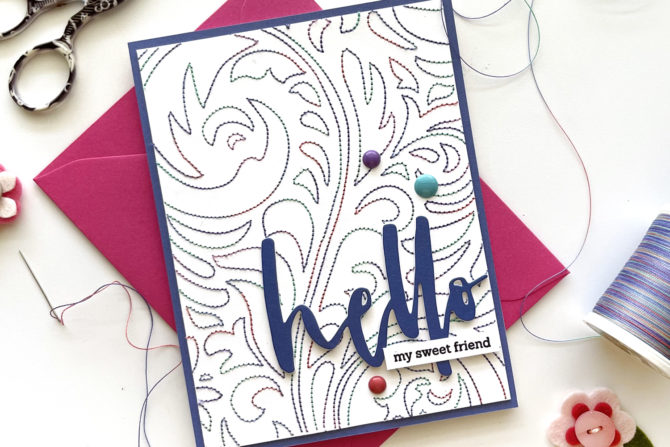 I used the Dotted Swirls Debossing Die to make the pattern on Neenah cardstock, then I stitched the whole panel with the variegated thread pictured above. I die cut one layer of the Waterbrush Hello Die and several more layers of white cardstock to stack behind. The secondary sentiment is from the Hello & Hugs stamp set and the enamel dots are from the Our Family enamel dots pack.