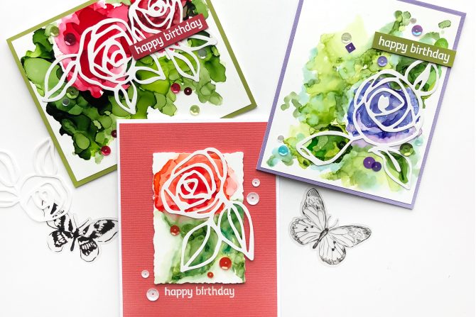 These three cards use the rose card stock die cuts in the kit, that I laid overtop of some creative alcohol inking.