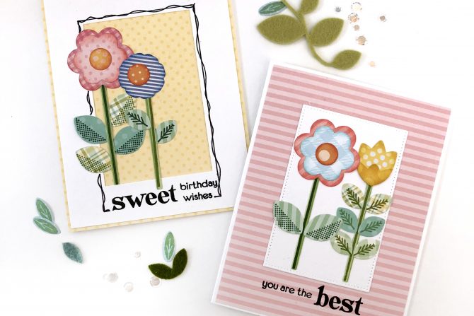 I love the look of die cut patterned paper shapes, so that’s what I was going for here. With the coordinating stamp set I was able to add some cute detail to the leaves and flower stems too.