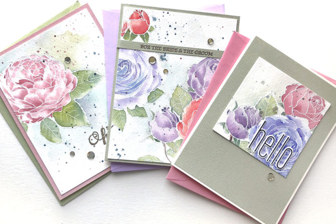 Card #1 uses the bouquet image in the stamp set, twice on one card panel, stamped on the right and left edges. I used the Altenew watercolor paper pad and heat embossed with white embossing powder.