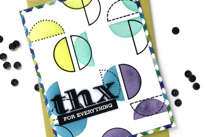 My first card uses the Modern Circles Stencil, Altenew Crisp Dye inks and the Altenew Blending Tool! I laid the stencil one direction on a piece of white cardstock and taped off 4 areas to blend with ink.