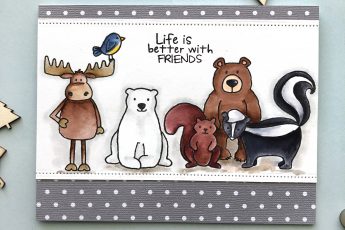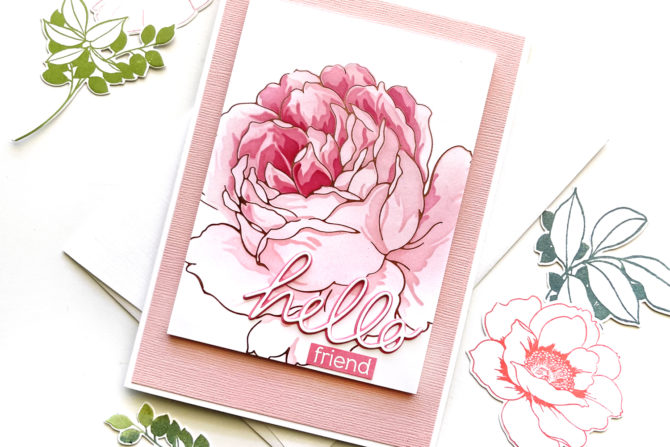 To keep the card simple, I die cut a layered greeting with the Handwritten Hello and stamped “friend” from the Halftone Hello stamp set. I used Paper Accents textured pink cardstock to mat the rose card panel, and trimmed it slightly smaller than an A7 card and adhered the layers to a folded card base.