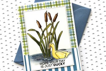 Once again, I stamped on patterned paper (an old plaid design by American Crafts, that I still had in my stash), for both the couch and cushions. This set includes the adorable floor lamp that I also stamped, colored with alcohol based markers, and fussy cut on the line. The trick to getting a good outline is to run the side of a black marker along the edge of the cut paper so that no white paper shows along the edge.