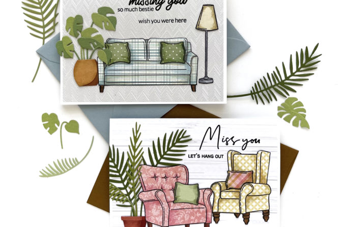For both of my cards today I stamped each of the chair/sofa stamps onto multiple patterned papers, and fussy cut them with fine tipped scissors. I fussy cut the pillows from other papers to coordinate with the rest. Then I used Copics and Altenew Artist Markers to add shadows, giving the images depth and dimension.