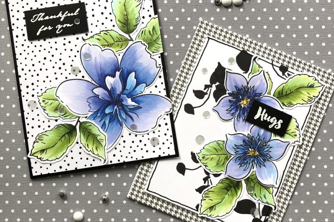 The leaves on each of these cards are colored this way. The blooms are completely colored with alcohol Artist Markers. The list of colors I’ve used and the process of stamping and coloring are all detailed in the post on the Altenew blog.