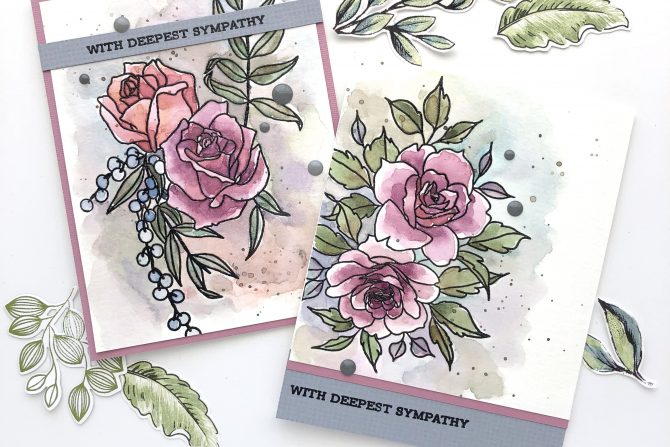 For both cards, I used the Sentiment Strips stamp set, and stamped and clear heat embossed onto a textured grey cardstock from my stash. I tried to keep the cards very simple to really allow the painted florals to shine.