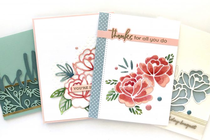 My first two cards today are a two-fer. I cut one of the dies from watercolor paper using the Spring Roses Die Set and held it all together with the use of some Glad Press N Seal. While intact like that, I loosely painted the flowers and leaves with Altenew Watercolor 36 Pan paint set and set it aside to dry.