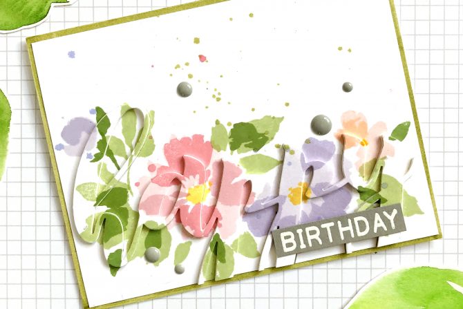 Once I had my card panel all stamped, including some ink splatters which I achieved by smooshing the ink pad onto a watercolor palette, picking up with a wet paint brush and flicking onto the paper, I positioned the “happy” die over the floral design allowing it to hang off the bottom edge. I die cut the word being careful to not lose any of the stray pieces.