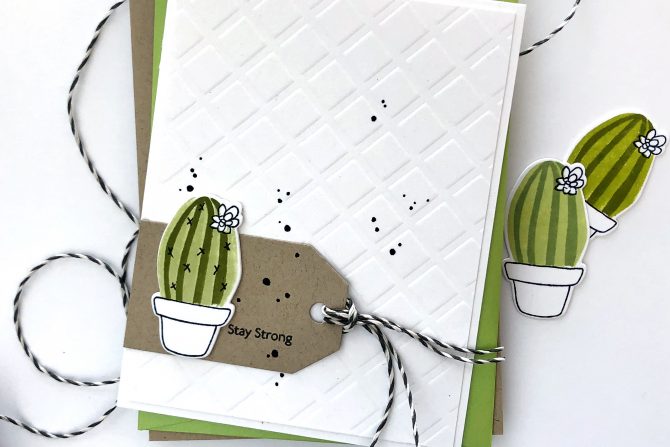 I die cut the tag from Neenah Desert Storm kraft cardstock using the Terrific Tags Die set and stamped the sentiment from the Mini Delight set on it. I adhered the cactus to the tag, tied some black and white baker’s twine in the hole and adhered that to the white card panel.