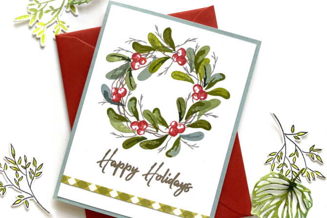 You’ll notice the bottom right corner of the wreath has leaves going in opposite directions from each other, which means that at some point around the circle they will also have to run into each other at the tips. If I were to make this design again, I’d keep all the leaves going in one direction only for simplicity of arranging the leaves. I didn’t worry about keeping leaves from overlapping each other, but did try to avoid stamping over the berries and needing to use the mask again, although that did happen in one spot.