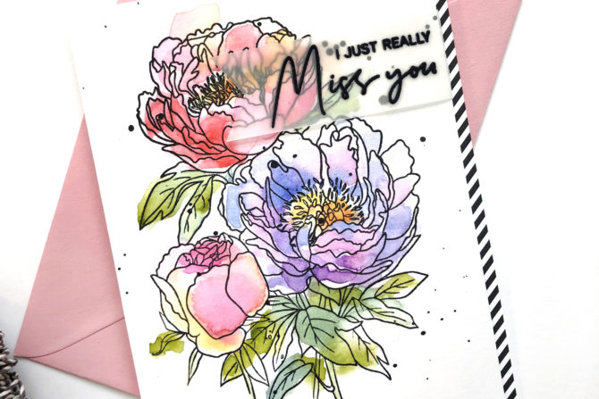 Once the paint was dry I added some black paint speckles. I stamped two of the individual greetings in the Coral Sunset stamp set onto vellum paper, using an embossing ink pad and heat setting with black embossing powder.