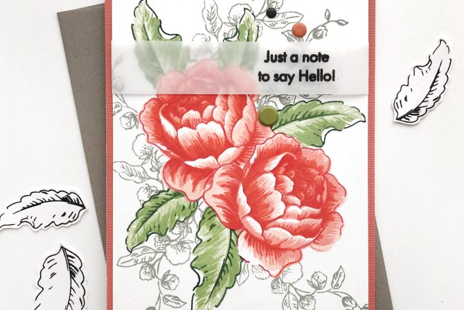 To create my card, I stamped a bloom onto masking paper and cut it out so that I could design a “bouquet” of two blooms with the leaves and vines tucked in behind. I used the Tea Party ink set, with Pink Pearl, Coral Bliss and Heart Beat inks for the blooms and the Greenfields Ink set with Frayed Leaf, Forest Glades and Evergreen for the leaves. I stamped the vines with Gray Denim ink from the Gentleman’s Gray ink set.