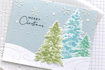 I used one of the same images again on one of the papers in the Gel Printing Soft Washes paper pad, stamping with Permanent Black Crisp Dye ink and leaving it uncolored against the Northern Lights-esque sky backdrop. I stamped another of the sentiments in the Cozy Winter Vibes stamp set, then added some white cardstock die cut snowflakes from the Layered Snowflake Dies set.