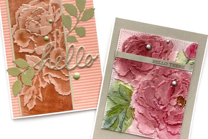 My second card uses the same Frilly Peonies embossing folder, but this time I used a piece of watercolor paper to emboss with this gorgeous design. That way I could lay down an under-painting layer of watercolor all over the blooms and leaves (and beyond) that adds color but hardly any shading or definition.