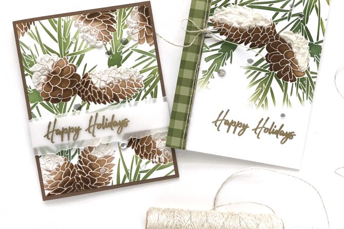 For both cards, I used Coffee Break ink family to stencil the pinecones, and a combination of Olive, Evergreen and Mountain Pine from the Tropical Forest, Green Fields and Green Valley color families respectively, for the needle/branches.