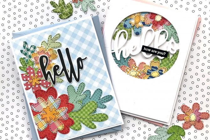 My next two cards are created using the Simple Nesting Flowers Layering Die Set. I wanted to use a wide assortment of patterned paper from my stash so I just started die cutting all the shapes and sizes of flowers and leaves. I quickly realized that by using multi-colors and patterned papers I would lose some of the shape definition, so I then used a fine-tip multi-liner pen to add stitching lines around all of the shapes, reminiscent of stitched appliqué quilting. Yes, that took some time, but I was listening to an audio book and it was soothing and therapeutic time!