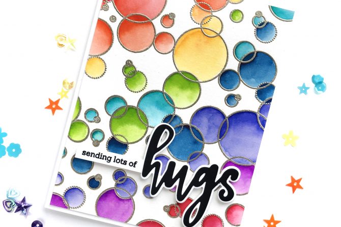 To begin, I stamped onto cardstock from the Altenew watercolor paper pack, with the background stamp design from Pattern Play: Circle stamp set and heat embossed with platinum embossing powder. Then I used a rainbow of colors of Altenew watercolor brush pens to color in all the circles. In order, I used: Crimson, Autumn Blaze, Warm Sunshine, Lime, Lagoon, Desert Night, Persian Blue, Midnight Violet and Ruby Red.