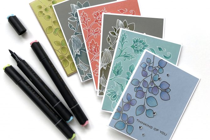 I used the Sketchy Floral, Leaf Canopy and Persian Motifs stamp sets for these cards because they have plenty of open space for the coloring.