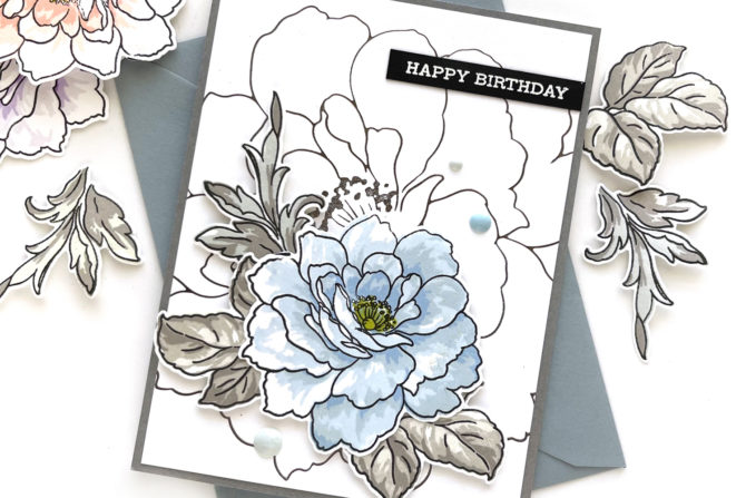 I began by hot foiling the flower outline onto white cardstock, then used the stencils to add color, with Strawberry, Blush and Peach Parfait Crisp Dye inks.