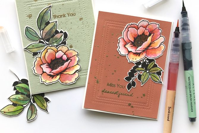 For this pair of cards that are almost identical but for the colors of card panels and the sentiments, I stamped images from the recently released Wallpaper Art stamp set onto watercolor paper, then painted them with the markers and die cut them with the coordinating dies.