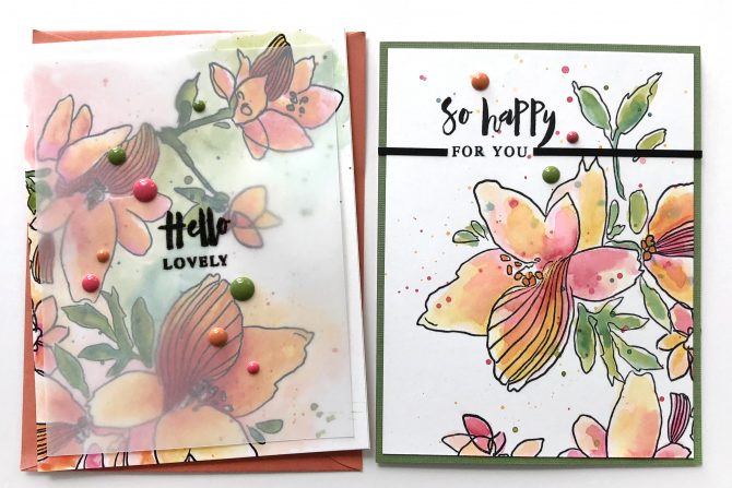 For both cards, I’ve added splatters of color to finish up, and I accomplished that by scribbling the Watercolor Brush Markers onto one of the Altenew watercolor palettes, and using a wet paint brush to dilute the colors, and to tap lightly to produce the colored spots.