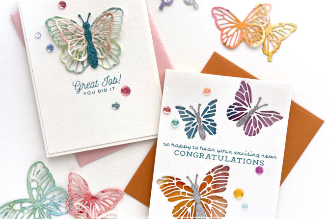 I used the same Moondust Glimmer Foil to hot foil the sentiment on the card front, then covered the back of the die cut panel with foam tape to elevate the die cuts above the painted backgrounds. You could also make the butterflies into their own individual shaker element if you so desired!