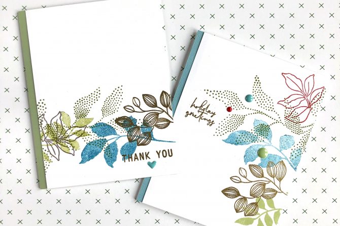 - Open-leaf image stamp from the Flower Garden stamp set, stamped in Vineyard Berry for the “holiday greetings” card, and Moon Rock for the “thank you” card.