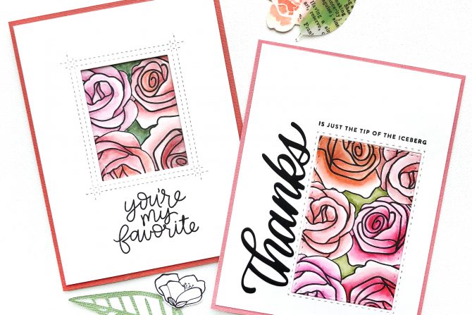 I treated the second card much the same as the first, but this time created a window that is popped up above the stamped and colored image. I used the MFT Peek A Boo stitched window die to create the opening and stamped the sentiment with this Mama Elephant Scripty Notes stamp set.