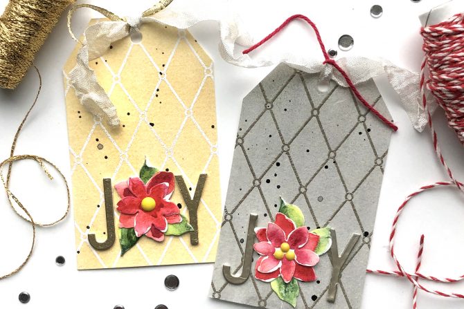 To finish, I arranged the dried layers of poinsettia-like flowers with leaves behind them and adhered them to the bottom center of the tags, then adhered the J and Y on either side. I added some enamel dots to the flower centers, tied ribbon and twine at the top and there you have it! I wish you could really see the subtle shimmer on the tags – it’s quite yummy.