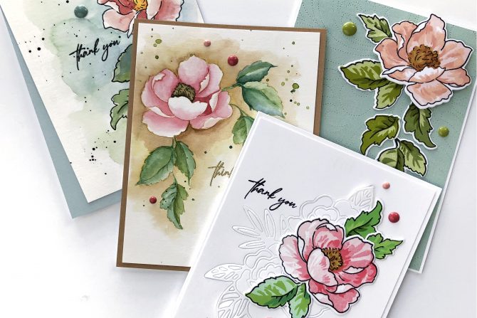 I made 4 cards that have in common, a newly released stamp set called Nature Blossoms. This is my favorite style of stamp set from Altenew, with outline images that work alone, AND layered images for easy stamp-coloring. Two of my cards today use only the outline stamps and the other two use the layering stamps.