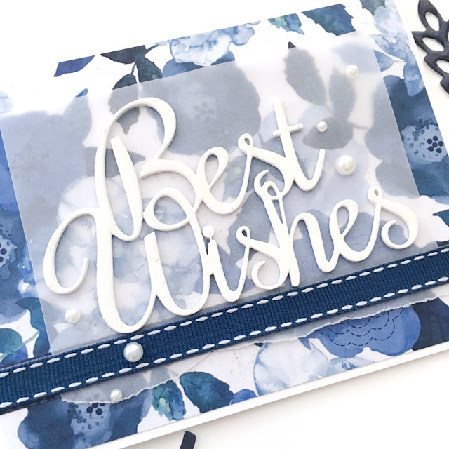 I painted it with white spray paint and layered it over vellum and some of that gorgeous paper from the Kaisercraft Indigo Skies line. I added a piece of ribbon (when’s the last time I ever did that??) and some pearls to create this simple but elegant card.