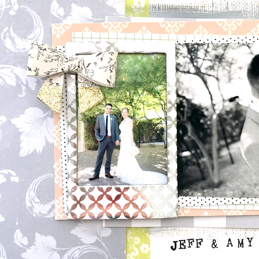 To create balance between the larger b&w photo on the right, I printed the smaller photo in color, and framed it with a gold foil chipboard frame from a Becky Higgins Project Life kitand added a gold sparkle paper bow from Maggie Holmes and Crate Paper.