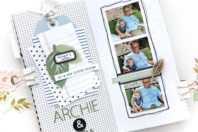 Next up is a layout featuring three small, series photos, taken last summer at the cottage, of Papa and Archie, just chilling on the swing. It’s a spot that induces a Zen-like feeling in most people so it should come as no surprise that it had that effect on Archie too!