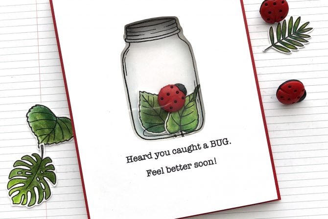 I used metal snips to remove the shank from the back of the button, but even at that, I had to use 3 layers of dimensional foam tape to create a deep enough shaker window to accommodate the little bug. I thought about adding enamel dots or ink splatters but the absolute clean-and-simple-ness of this card was too pleasing to mess with.