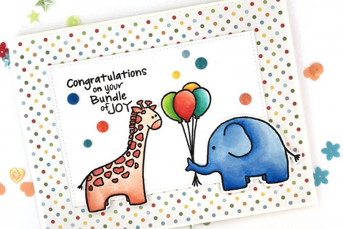Finally, I stamped the elephant and balloons onto watercolor paper and used my new Altenew watercolor paint set (coming soon!) to paint the images. I die cut the scene with a stitched circle die from Die-Namics and laid it over top a couple of coordinating patterned papers. A few more enamel dots complete this card.